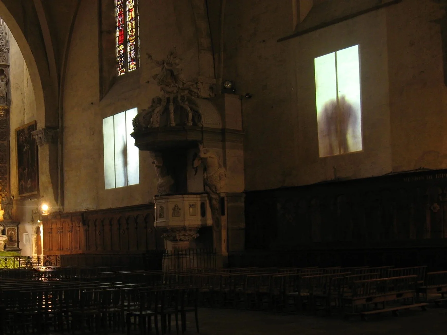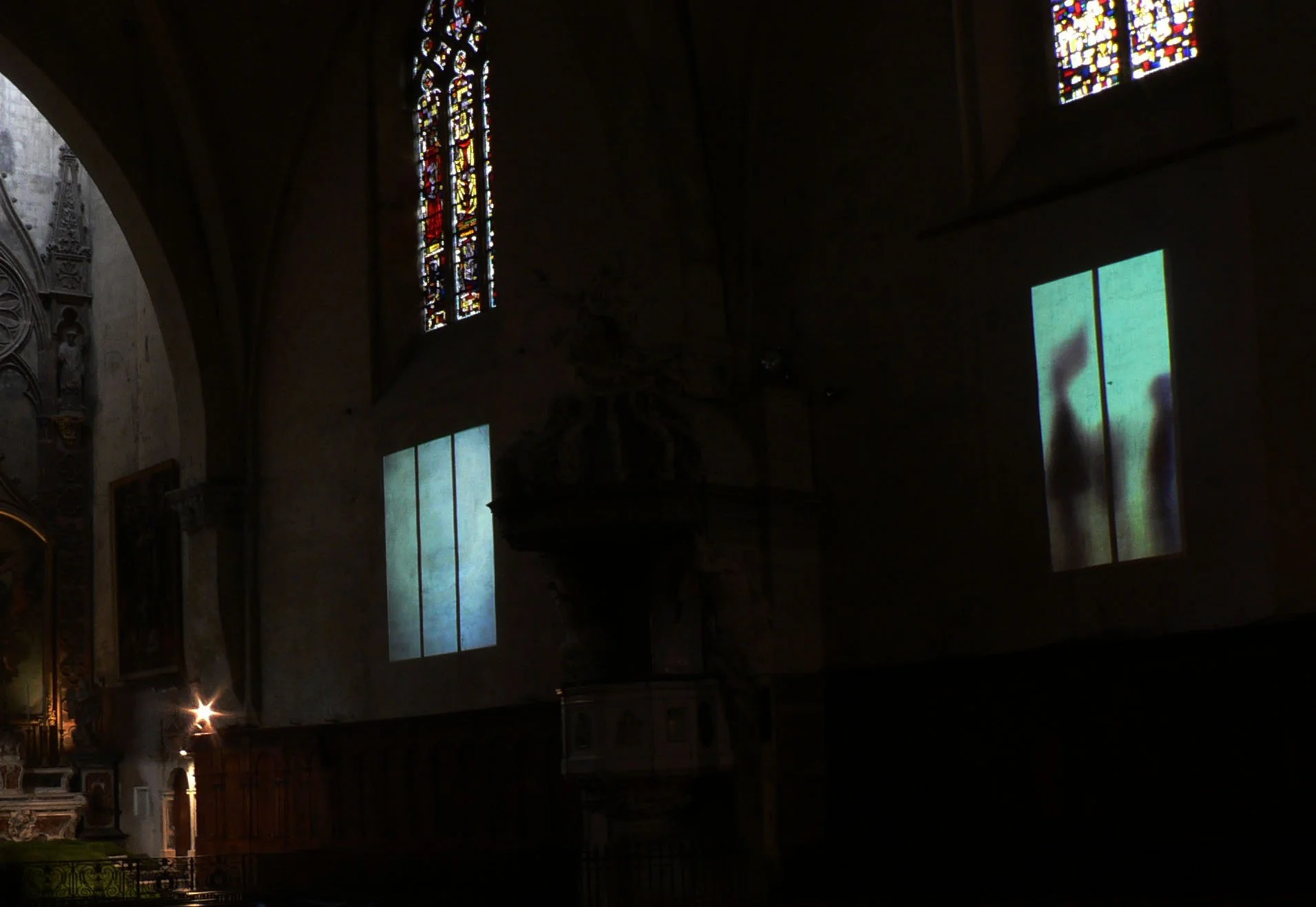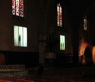 The installation extends the galls windows, turning them into openings to the outside world and highlighting passerby, protests, everyday events.
